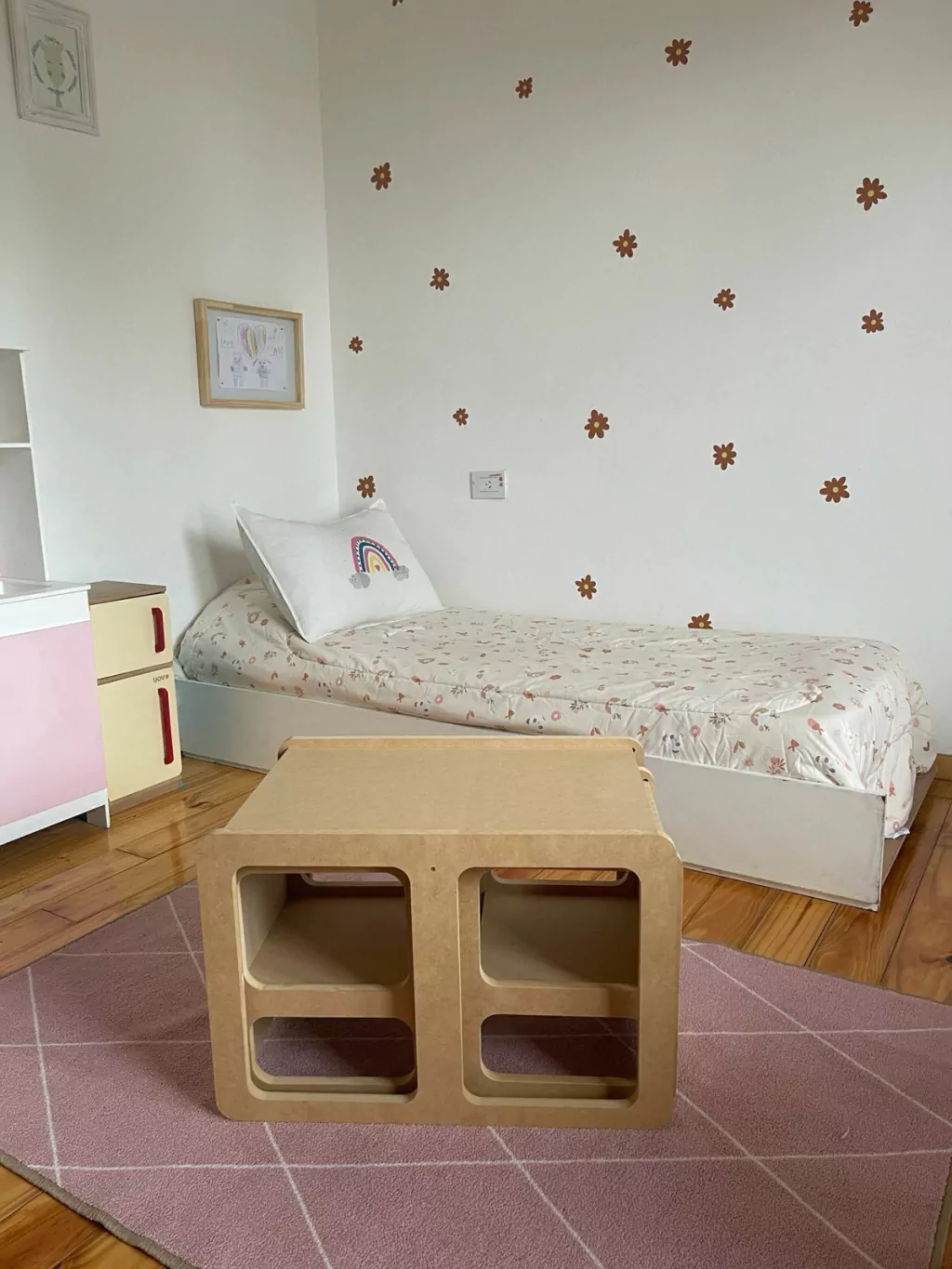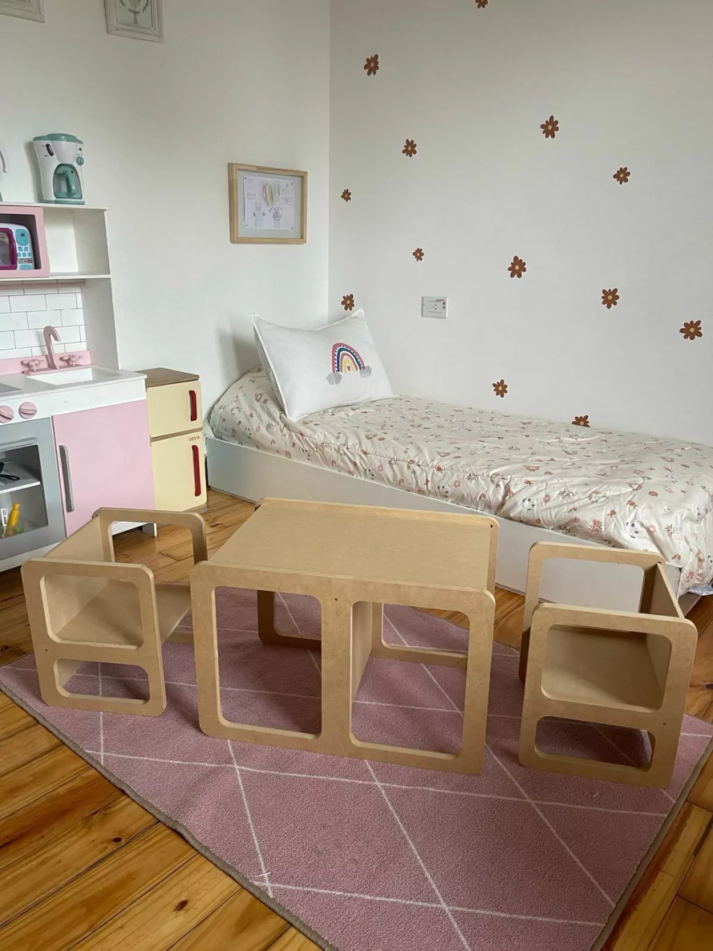 Hecho para crecer, aprender y crear en libertad. El Combo Mesa + 2 Sillas Evolutivas Montessori acompaña a los chicos en cada etapa, adaptándose a su crecimiento y favoreciendo la independencia. Su diseño funcional permite que mesa y sillas evolucionen en altura y uso, creando un entorno cómodo y seguro para jugar, dibujar o aprender.
