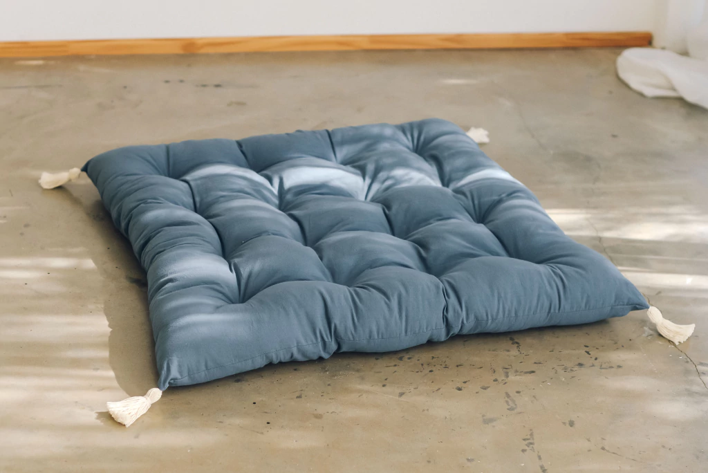 Está confeccionado en tusor liviano 100% algodón, teñido a mano, lo que hace que cada pieza sea única y especial. Su relleno de vellón siliconado brinda una comodidad inigualable, y las elegantes borlas de fleco en las puntas le dan un toque distintivo y encantador.